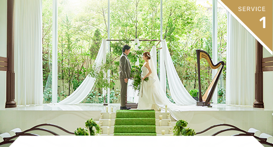 自社運営の緑あふれるゲストハウスと、さまざまな提携結婚式場をご用意しています。会場からドレス、当日の演出まで、担当プランナーが細やかにサポート。